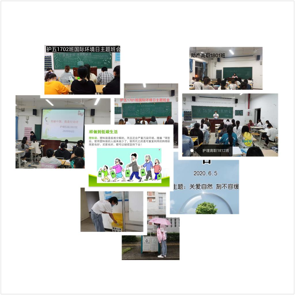 各班辅导员、班主任采用板报、PPT等多种形式,向同学们普及了国际环境日的由来及目的,通过对当前存在的十大环境问题的解说,让同学们明白了环境问题的严重性和紧迫性。辅导员、班主任呼吁同学们热爱自然,保护环境,做美丽中国的行动者。护理五高1707班班主任孙会娟以“关爱自然 刻不容缓”为题,向同学们详细解说了当前存在的十大环境问题,让同学们明白了环境问题的严重性和紧迫性。她要求同学们要积极参与我国的生态文明建设,参加学校举行的环保活动,做好垃圾分类,健康绿色出行,用实际行动建设文明环保校园。护理高职1814班辅导员乔欢以今年新冠疫情为切入点,讲解了生物多样性对生态环境的重要性。她希望同学们参与到低碳生活中来,拒绝一次性生活用品,绿色低碳出行,节约用电,珍惜能源,创建绿色家园。