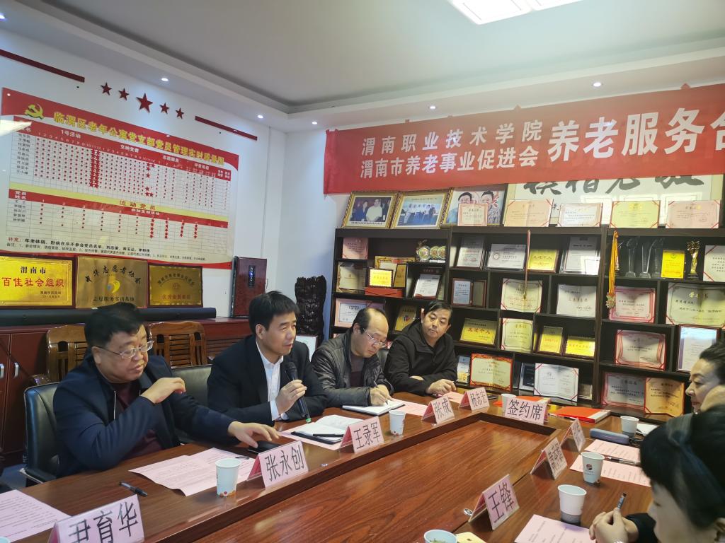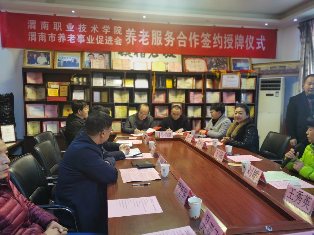 为推动渭南养老服务与管理事业发展,提升我院学生的养老服务能力与素养,12月13日下午,十大买球与渭南市养老事业促进会在临渭区老年公寓签订了合作协议,并举行了老年服务与管理专业首个校外实训基地挂牌仪式。渭南市民政局副局长张永创、社会福利科科长杨志宏,渭南市养老事业促进会会长王锋、临渭区老年公寓院长黄秀娟,十大买球副校长王录军、对外交流合作处处长尹育华、十大买球的正规网站院长张成、副院长吴亚飞,老年服务与管理专业带头人任秋爱等出席会议。