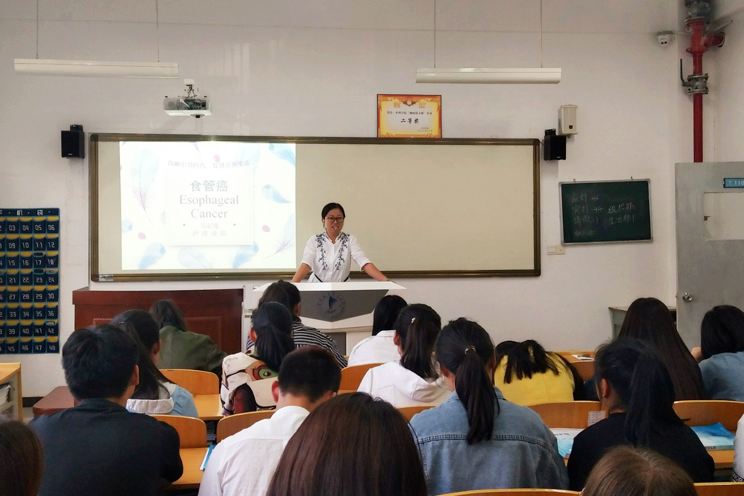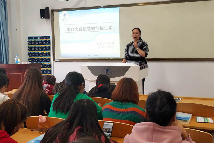 马彩霞以预防食管癌为主题,她从流行病学出发,向学生讲解了食管癌的病理、临床表现、诊断、鉴别诊断和治疗等几个方面。她通过讲述实际案例,将食管癌诊断和治疗中的注意事项作了说明。张文娟老师从抗生素的简介、特点、分类及其合理使用等几个方面对抗生素做了讲解,向同学们介绍了现阶段国内外抗生素研究的最新进展,帮助学生掌握抗生素的相关知识。报告会中,两位老师结合自身研究方向和学生的学习特点,报告会内容丰富、讲述生动有趣,获得在场学生的一致好评。