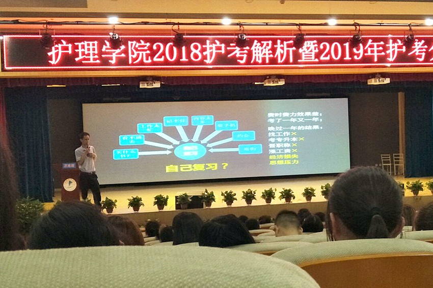 齐向飞从近年来的护考情况入手,详细分析了护考试题中的难易点,指出学生备考2019年护考的注意事项。他建议学生应认真阅读护考大纲,谨慎选取护考培训教材,详细规划备考时间,注意知识点积累,攻克知识难点;冲刺阶段要把牢做题这一主要任务,摒弃杂念,冲出护考线。齐向飞讲解深入浅出,语言幽默,所举实例贴近学生实际,赢得了学生的阵阵掌声。