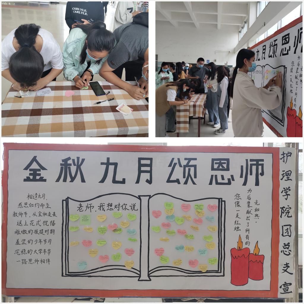 本次活动由我院团总支通讯部主办。通讯部部长方晓玉向学生代表宣讲了本次活动的主旨,感恩老师的爱心,感恩老师的劳动,感恩老师的教诲。她希望学生代表在班级宣扬尊师重教传统文化,将感谢师恩的团课精神落实到实际行动中。“教诲如春风,师恩似海深”“老师,您是美的耕耘者,美的播种者,使我们心田绿草如茵”“祝您事事顺心”……学生代表用便利贴写下一句句心里话,并贴在展板上表达对老师的祝福,感谢老师的无私奉献。