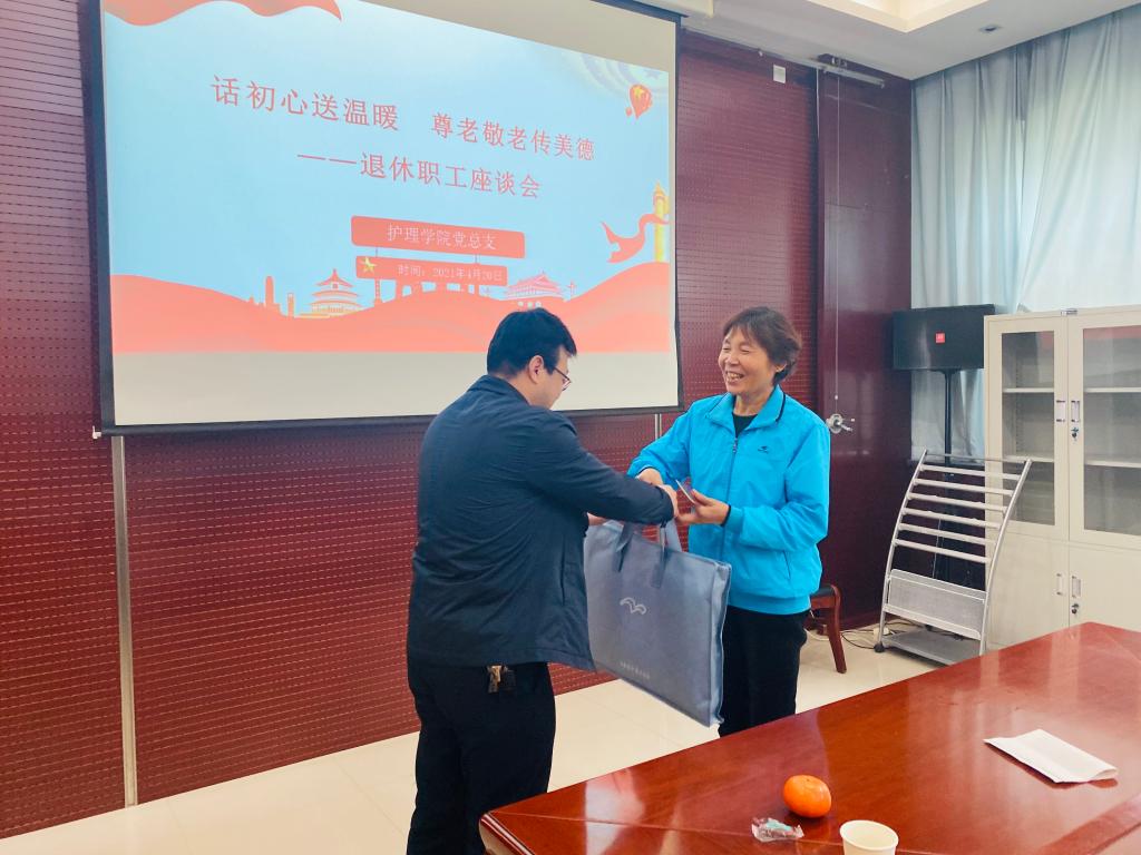 4月20日上午,十大买球的正规网站在医训楼第一会议室召开了以“话初心送温暖,尊老敬老传美德”为主题的退休职工座谈会。我院党总支书记吴运胜、院长张成、副院长吴亚飞、任秋爱、副书记李晓乾以及教学科、学生科部分同志与年内退休职工参加。