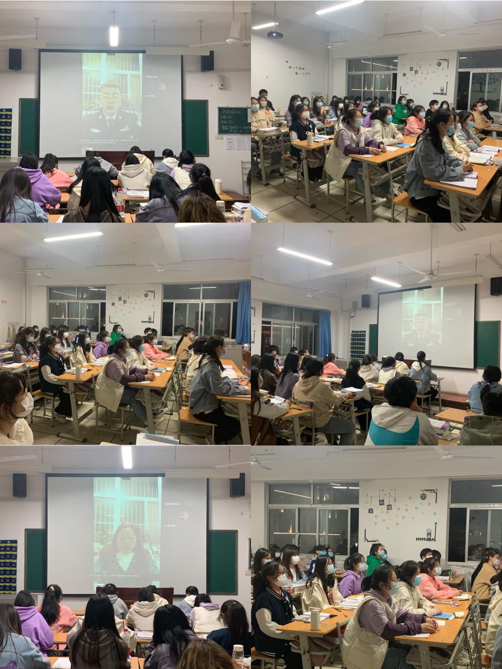 报告会上,屈警官通过腾讯会议的形式现场直播,辅导员和班主任组织各班利用教室网络及多媒体在教室开展线上聆听。他通过“青年兴则国家兴,青年强则国家强,青年是国家的未来和希望;人生最宝贵的是什么?当代青年大学生如何做到守法?如何有效防范不法侵害?”等四个方面,用同学们现实生活中的实际案例和法律知识相结合,将涉及未成年人的问题与学生日常生活学习情况紧密结合,用通俗易懂的话语,分别对校园欺凌、网络安全、疫情防控法律、交通安全及未成年人保护法等知识开展专题教育宣传讲解,引导学生要运用法律武器和安全防护知识来约束自己、保护自己,同时告诉学生们在面对不法侵害时应根据实际情况随机应变、加强自我保护,及时拨打报警电话。