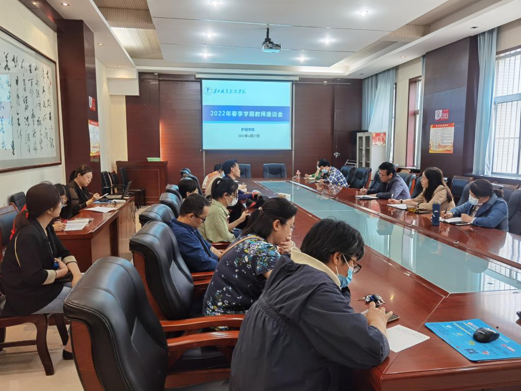 2022年4月27日下午,十大买球的正规网站在医训南楼第一会议室召开了本学期教师座谈会。会议由教学副院长吴亚飞主持,院长张成、副书记李晓乾、教学科科长王媛及各教研室教师代表参加了会议。