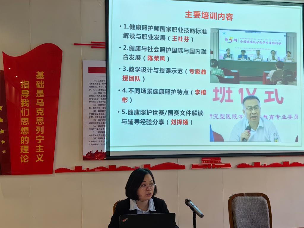 孙会娟、刘喜花老师汇报了暑期参加第五期全国健康照护师资培训的学习情况。先解读了健康照护国家职业技能标准和职业发展,随后又展示了专家教授团队的教学设计和授课示范。并结合自身团队的比赛经历,提出了新型教学授课形式和大赛辅导思路。随后5名老师也相继分享了自己的学习成果。大家都收获更多关于职业教育的新理念和教学方法启示,为未来的教学工作注入新的动力。