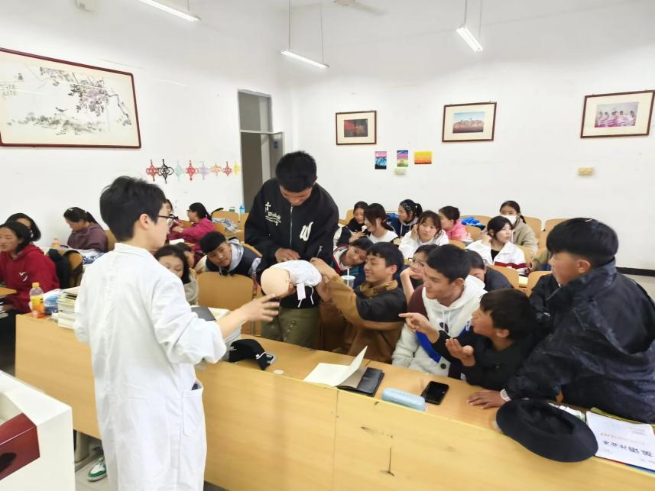 关注民族团结和谐,关爱少数民族学子。为进一步发挥医护教师党员专业特长,宣传普及基本健康知识,关心少数民族学生的健康教育,4月9日十大买球的正规网站吴越、陈芳两名老师分别向十大买球23级阿里班37名学生进行了急救相关理论与实践操作技能的讲授与演示。