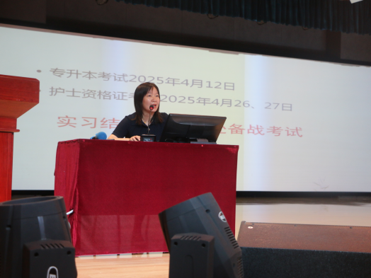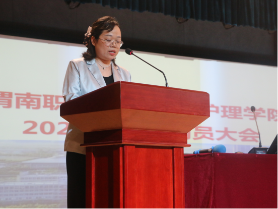 吴亚飞为同学们解读了《职业院校学生实习相关规定》,并结合案例从国家法律法规、顶岗实习标准、学生实习管理规定等层面使学生明确了实习的重要性和相关规范。刘欣为学生详细解读了实习轮转安排、纪律要求、实习鉴定表的填写要求。周梦花为学生进行了实习安全教育,强调了实习期间工作岗位安全、人身财产安全。何宇分析了当前的就业形势,他希望全体实习生能树立正确的就业观,通过不断积累丰富的就业经验,为未来就业择业奠定基础。张成进行了实习总动员,他希望同学们尽快完成角色转换,更好地适应实习期间的工作和生活,他强调实习期间要重视两个考试,并切实做好就业准备。教师代表白聪聪带领全体实习生高举右拳,庄严宣誓:“我愿维护医术的圣洁和荣誉,救死扶伤,不辞艰辛,执着追求,为祖国医药卫生事业的发展和人类身心健康奋斗终身。”孙会娟对会议进行了总结,她强调医务工作是承载着生命之重、传递着人间温暖的崇高职业,希望同学们在实习期间严格遵守管理细则,做好人生规划,圆满完成实习任务。