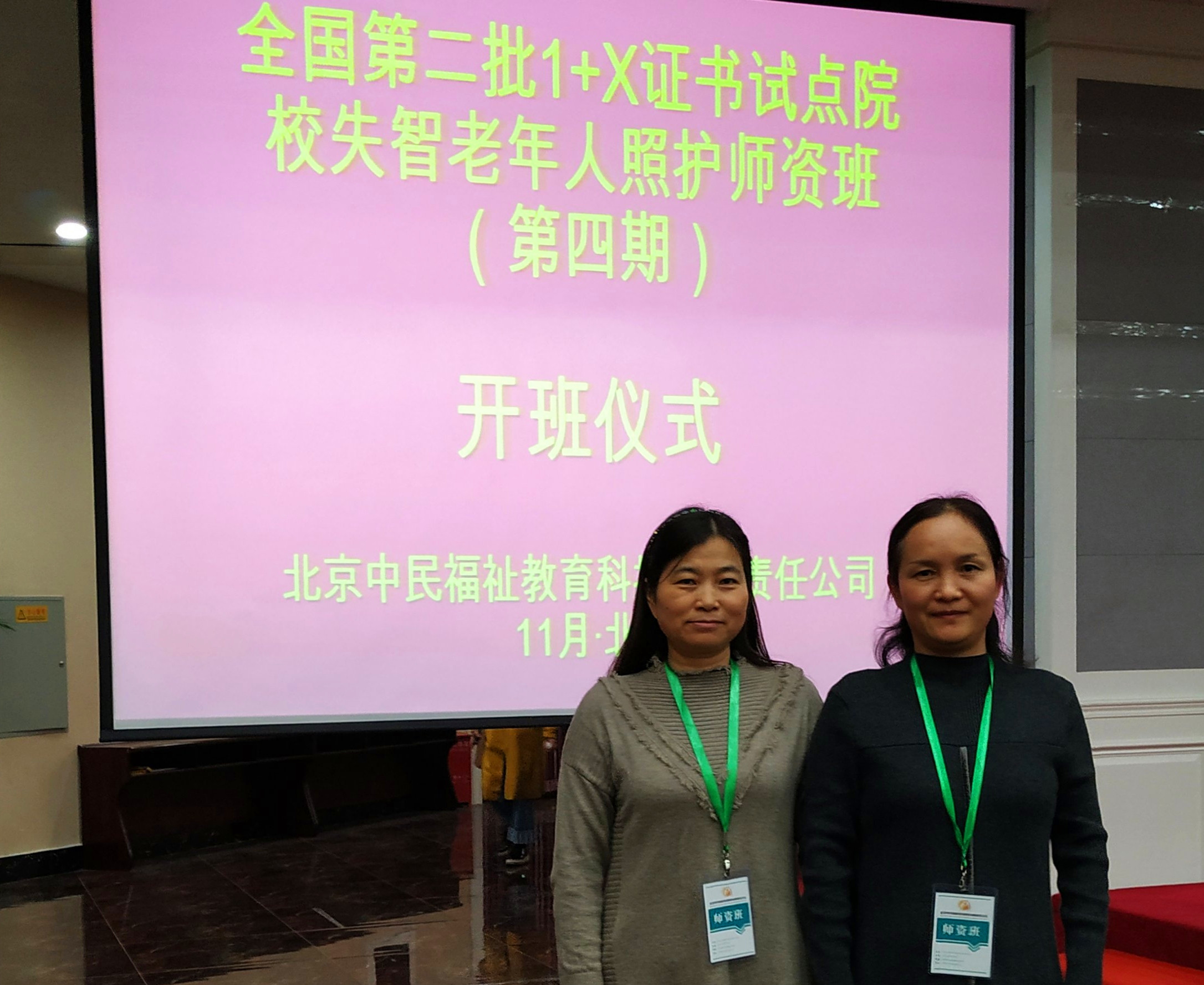 为贯彻落实《国家职业教育改革实施方案》,稳步推进“学历证书+若干职业技能等级证书 ”制度试点工作,2019年11月6-10日,教育部第二批1+X证书制度试点工作失智老年人照护说明会与师资培训班(第4期)在北京市通州区运河苑度假村举行,我院任秋爱、张小红两位老师与来自全国50多所职业院校教师及20余所养老机构的专业人员参会培训。