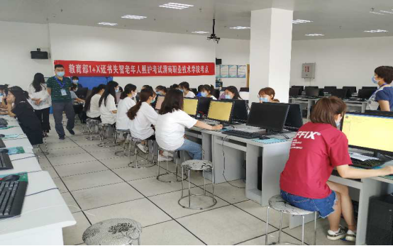 为扎实做好本次考试的备考和培训工作,3月初,在防控新冠疫情的特殊形势下,我院鼓励同学们通过微信群里老师上传的PPT以及职教云平台上的失智老年人照护(1+X证书 初级)课程进行学习。5月17日返校后,辅导老师利用课余时间对报考学生进行辅导,力争使同学们胸有成竹地步入考场。我院在技术支持部门及考试指挥中心的指导下,于6月20日完成了教育部1+X证书试点工作失智老年人照护全国统一考试。本次考试共有26名同学参加,分为照护实务和实践能力两个场次。考试由培训评价组织北京中民福祉教育科技有限公司负责实施,采用在线机考模式进行。