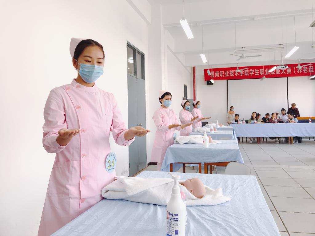 为了夯实学生的理论基础,强化操作技能,根据学校工作安排,十大买球的正规网站于9月23日下午在医训楼北楼312实训室举行了2020年学生技能大赛(养老组)的比拼。我院副院长任秋爱等出席了比赛,祁晓民等5名专业老师担任大赛评委。进入决赛的24名选手在血压测量、轮椅运送老年人和新生儿抚触三项常用护理技术展开激烈的角逐。