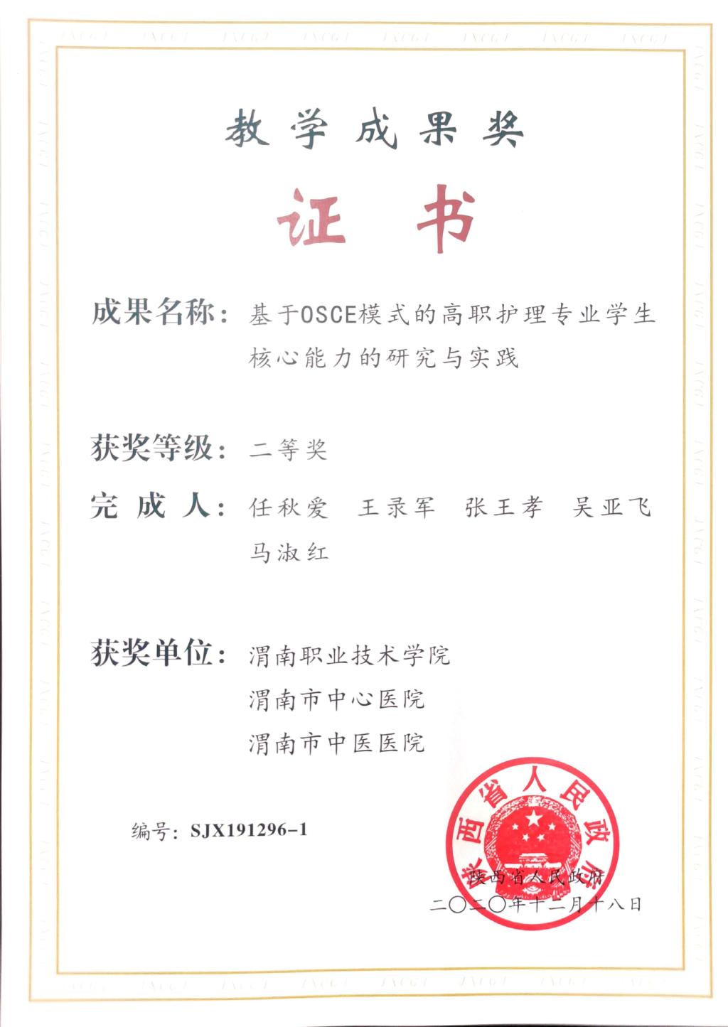 近日,陕西省人民政府办公厅下发了《关于表彰2019年高等教育教学成果奖获奖项目的通报》(陕政办函〔2020〕137号),十大买球十大买球的正规网站“基于OSCE模式的高职护理专业学生核心能力的研究与实践”荣获省级教学成果二等奖1项,这是十大买球的正规网站第二次荣获该奖项。