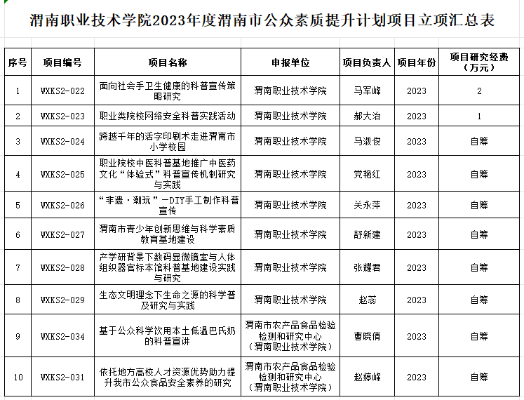 2023年12月,根据《渭南市公众科学素质发展研究中心关于征集2023年度渭南市公众科学素质提升计划项目的通知》渭科素〔2023〕1号文件精神,我院精心组织,教师积极响应,按照申报指南,由二级学院申报,征集渭南市公众科学素质提升计划项目30项,经科研处审核,院内专家评审,市级专家审核,我院(含渭南市农产品食品检验检测和研究中心)最终10个项目获批立项。