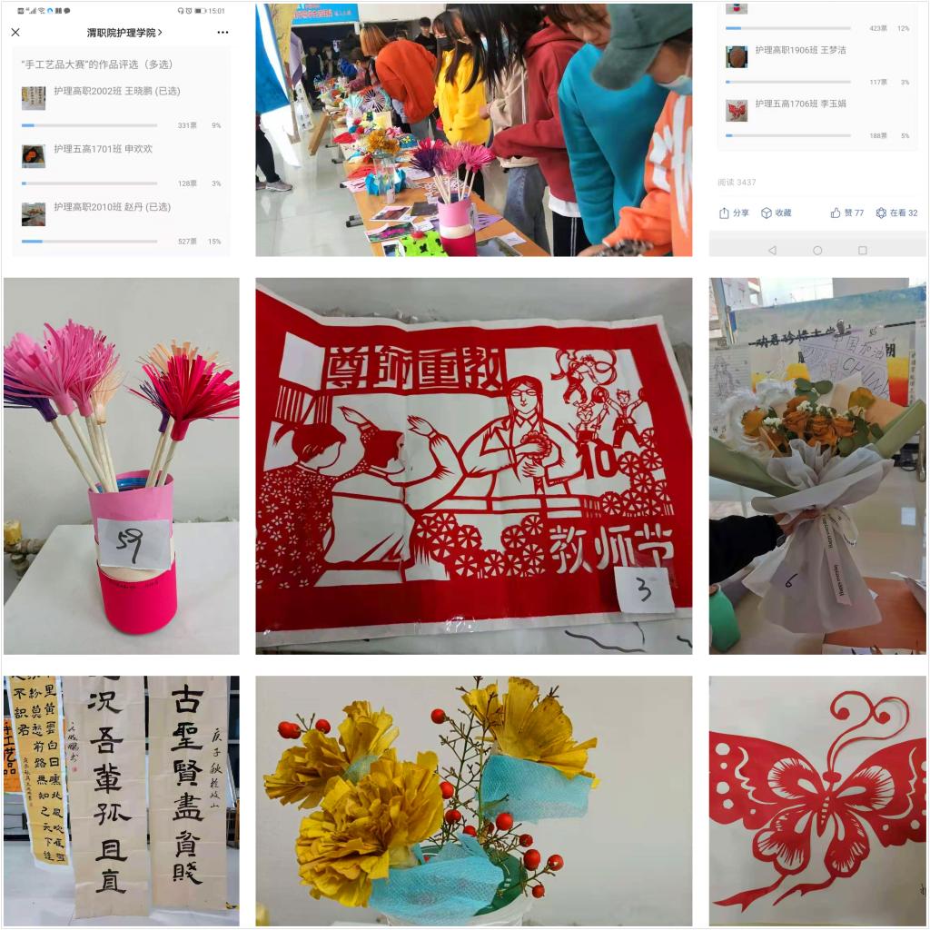 本次活动由我院学生会宣传部承办,分为收集和展评两个阶段,宣传部从我院60余个班级中,选出100余份作品进行展评。展评采用线上线下相结合的方式,展出作品包括书法、国画、剪纸、废弃物再利用等手工作品。经同学们投票,护理高职2010班赵丹同学循环利用十大买球银杏林的银杏叶制作了美丽花束,构思新颖,香气迷人,引人驻足观看,荣获一等奖;护理五高2003班安琪同学以“尊师重道”为主题制作了剪纸,表达了对老师的感谢之情,获得二等奖;护理高职2002班王晓鹏同学手书的隶属“自古圣贤皆贫贱,何况我辈孤且直”体式完整、苍劲有力,获得第三名。