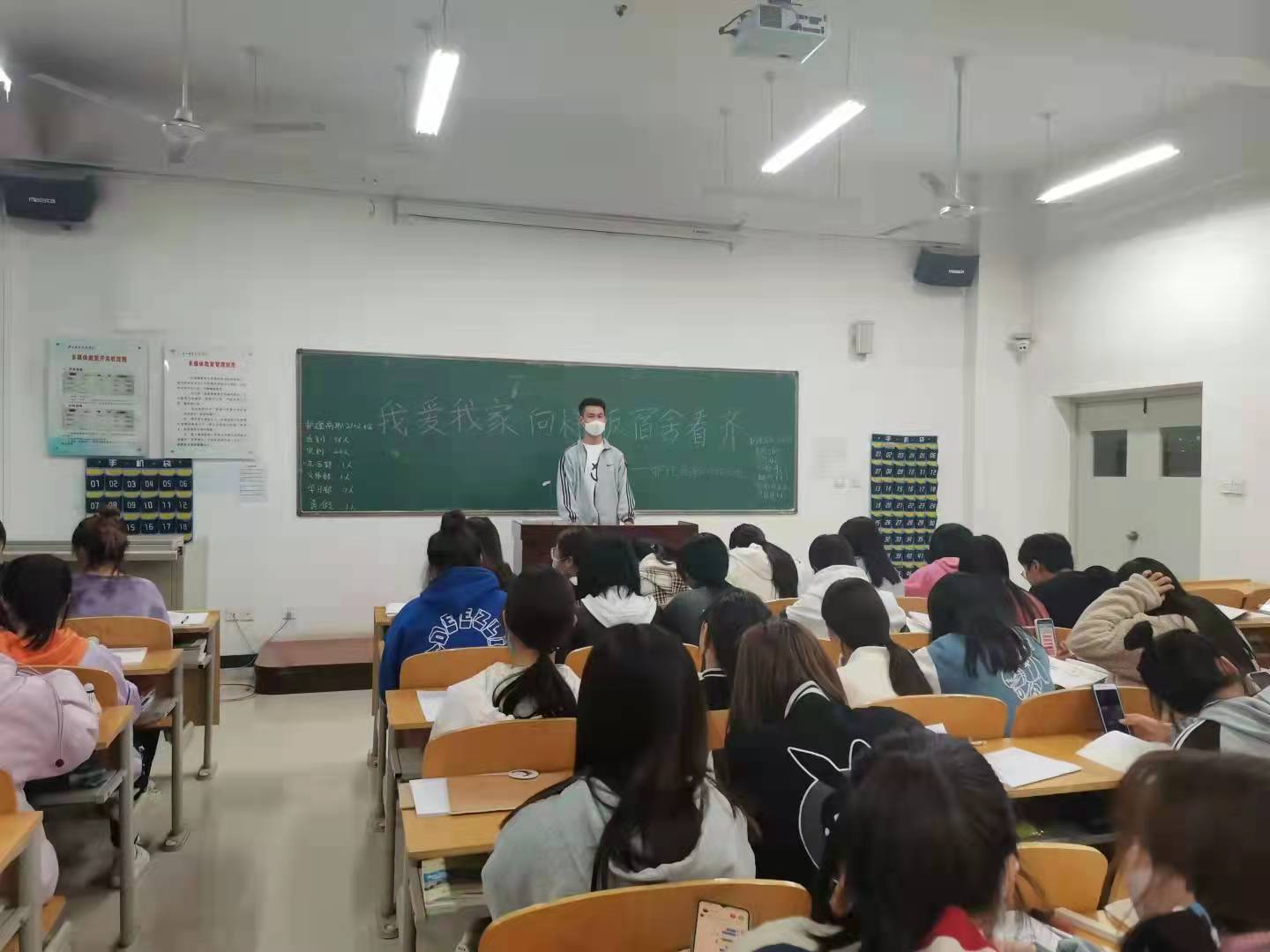 在班会课上,班长首先讲述了本次班会的目的,强调了宿舍可能存在的不安全隐患。接着,班长组织各宿舍舍长进行了班会发言,针对宿舍存在的问题及相关案例进行了探讨与交流。舍长一致表示要杜绝脏、乱、差的宿舍环境,严格执行学院下达的卫生任务,督促同学们保持宿舍卫生的干净整洁,向文明宿舍看齐,对不文明行为说“不”。同时,告诫每个学生都要严格要求自己,严于律己,以最高的行为准则标榜自己,做样板宿舍的发起人与行动者,争做人人文明者,人人都是卫生小标兵。最后,在舍长的积极带动下,同学们得到了极大的鼓舞。以样板宿舍为模板,保持宿舍的干净、卫生、整洁。同学们表示要积极配合舍长的工作,争创文明宿舍。